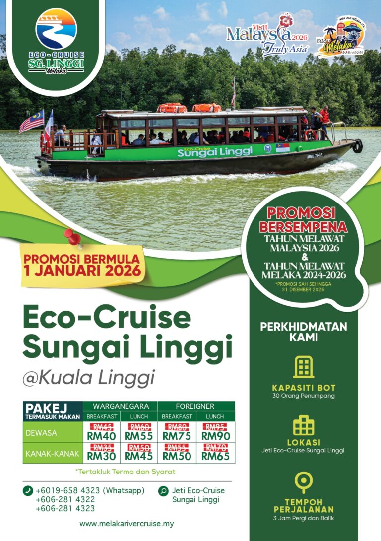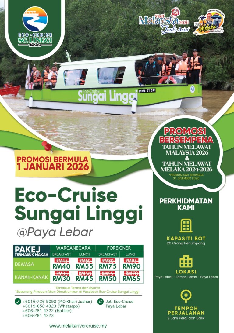 Eco Cruise Sungai Linggi is a package implemented in the north of the State of Melaka, Kampung Paya Lebar. This package is also available with several other packages such as enjoying food in the area around the Linggi River which is at a Floating Restaurant located in Taman Lokan.